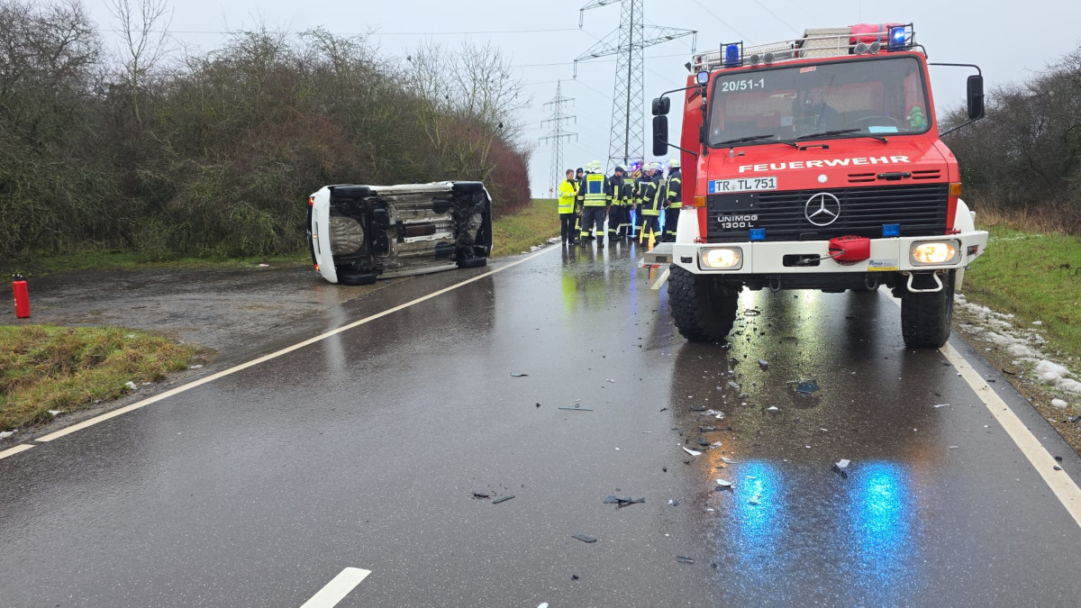 Trierweiler/Sirzenich – (Von Konrad Geidies – Bildergalerie am Ende des Beitrags) Auf der Kreisstraße 6 zwischen dem Industriegebiet Sirzenich und Trierweiler ist es am Montagmittag (17. Februar 2026) zu einem schweren Verkehrsunfall gekommen. Die Strecke musste zeitweise voll gesperrt werden. Gegen 13.30 Uhr kollidierten auf der Kreisstraße K 6 in Höhe der Römerstraße und der Straße „Auf dem Aaler“ zwei Pkw im Begegnungsverkehr.